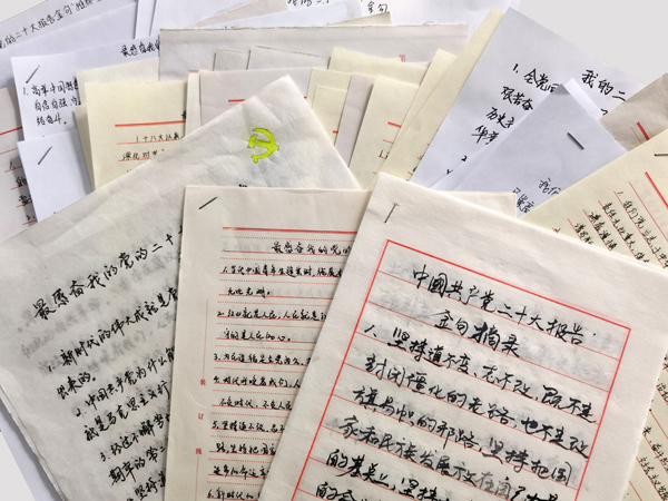 為進一步加深黨員職工對黨的二十大報告的學習理解,推進黨的二十大精神進頭腦、進思想,2022年11月26日至12月10日,公司黨委組織開展“最感奮我的黨的二十大報告金句”推薦活動。 通知一經下發,雖處疫情居家辦公期間,但大家的積極性絲毫不受影響。公司領導班子成員率先垂范,結合參加國務院國資委培訓中心學習貫徹黨的二十大精神網絡培訓班學習收獲,原原本本學習黨的二十大報告原文,共推薦金句112條。黨員職工認真學習黨的二十大報告,深刻理解報告中的新論斷、新要求、新部署,懷著崇敬的心情,一字一句工整地抄寫著金句,并表示,作為國企職工,要深入學習貫徹黨的二十大精神,立足本職、積極工作。十分公司王帥表示,通過摘抄黨的二十大報告金句,又是一次原原本本學習,通過抄寫,對報告內容又有新理解、新收獲,中國共產黨為人民謀幸福,從來都是動真情、出實招、辦實事。“作為一名黨員,要當好干事先鋒員,以奮發有為的姿態抓工作落實。對照黨的二十大的法治要求,響應黨的二十大的號召,我們要做社會主義法治的自覺遵守者、堅定捍衛者。”六分公司劉生說。五分公司丁江霞更是在認真抄寫黨的二十大報告原文的同時,把自己朗誦的黨的二十大報告金句錄制下來,發送到自己的社交平臺,讓更多的人投身到黨的二十大報告學習中來。 本次活動,每名黨員職工分段分條推薦并把黨的二十大報告中讓自己最受感動、最受啟迪、最受鼓舞、最受激勵的原文,用筆抄寫到紙上,每人最少10條,不設上限。用腦思考、用手抄,手腦并用,學習更高效。經統計,共計523名黨員職工參與,累計推薦金句5530條,最終公司黨委擇優評選出19個作品給予表彰獎勵。(黨委宣傳部)