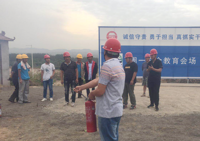 項目部即將進行墊層混凝土澆筑施工,現(xiàn)場有大量的木模板、油漆等易燃品,正值高溫季節(jié),火災隱患較大。項目部結合現(xiàn)場實際組織了本次消防演練,演練分為消防知識培訓和火災事故演練兩部分。演練前項目經(jīng)理李宏偉通報了溫嶺槽罐車爆炸事故造成的嚴重后果,闡明本次演練的目的和意義。隨后項目部安全員王東春對滅火常識、火災逃生方法、滅火器如何使用等進行了講解,并演示了手提式干粉滅火器的具體使用方法,參與演練的人員親自體驗了滅火器的使用。