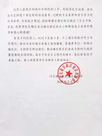 2021年2月下旬,公司收到雄安新區建設指揮部感謝信,信中就公司對雄安新區建設的支持幫助表示感謝,對選派到雄安新區工作的王現峰、孫文超同志給予高度肯定。