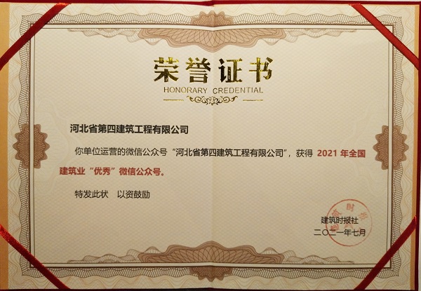 7月16日,在“2021建筑業(yè)微信公眾號運維經(jīng)驗交流研討會暨全國建筑業(yè)優(yōu)秀公眾號頒獎典禮”上,公司微信公眾號“河北省第四建筑工程有限公司”被評為“2021年全國建筑業(yè)優(yōu)秀微信公眾號”。
