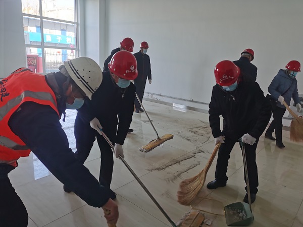一到現場,黨員們就摩拳擦掌、躍躍欲試。項目經理首先向孫長虹一行簡單介紹了項目基本情況和現場安全注意事項后,省直工會的黨員們就戴上安全帽,直奔輔助工房三區。他們手持拖布、笤帚在一層室內清理地板磚、整理雜物、倒運垃圾,干得熱火朝天。大家不顧室內的灰塵,認真地清理著地面上的雜物、清掃著每個角落。經過緊張工作,黨員們把三區一層房間和走廊打掃得干干凈凈,把裝飾材料、防水材料等雜物碼放得整齊有序。現場工人看到黨員們不怕臟,不怕累的勞動,都紛紛稱贊。勞動結束,在業主的帶領下,孫長虹、李懷生等黨員參觀了已經完工、正在試運行的制梗生產線。