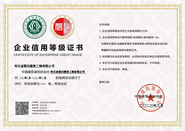 此次獲得中裝協(xié)AAA級企業(yè)信用等級證書,是中裝協(xié)對公司堅持守法經(jīng)營、誠信經(jīng)營的充分肯定和高度認可,是對河北四建實力和品牌形象的最好詮釋。(質(zhì)量技術(shù)部)