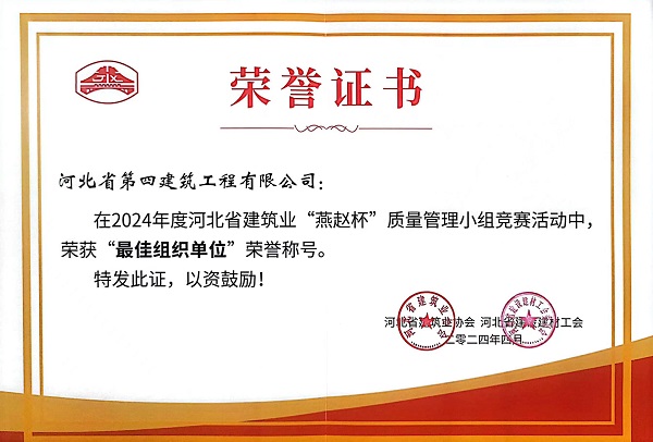 4月18日至20日,在河北省建筑業(yè)協(xié)會舉辦的2024年度河北省建筑業(yè)“燕趙杯”質(zhì)量管理小組競賽活動中,公司參賽的16項成果全部獲獎,公司獲“最佳組織單位”榮譽稱號。