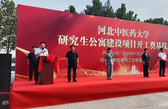 奠基儀式現(xiàn)場(chǎng),挖掘機(jī)、裝載機(jī)身披大紅花整齊排列,猶如即將出征的戰(zhàn)士,工人整裝待發(fā),信心滿(mǎn)滿(mǎn)、斗志昂揚(yáng)。儀式在歡快激昂的樂(lè)曲聲中拉開(kāi)序幕。主持人首先介紹了參加本次儀式的相關(guān)領(lǐng)導(dǎo)和項(xiàng)目概況。隨后,唐志強(qiáng)作為施工單位代表首先發(fā)言,“我公司有幸承接該施工任務(wù),充分體現(xiàn)了項(xiàng)目主管部門(mén)和建設(shè)單位對(duì)我們國(guó)有建筑企業(yè)的信任和支持。河北四建一定高標(biāo)準(zhǔn)、嚴(yán)要求,為項(xiàng)目順利實(shí)施提供有力保證,為業(yè)主提供滿(mǎn)意服務(wù),為河北中醫(yī)藥大學(xué)醫(yī)學(xué)教育的高質(zhì)量發(fā)展貢獻(xiàn)力量!”最后,學(xué)校黨委副書(shū)記孫士江表示,河北中醫(yī)藥大學(xué)研究生公寓為省政府支持骨干大學(xué)建設(shè)項(xiàng)目,希望參建各方全力以赴確保按時(shí)完工投入使用,建設(shè)“品質(zhì)工程”“一流工程”,促進(jìn)學(xué)校各項(xiàng)事業(yè)取得新成就,為經(jīng)濟(jì)強(qiáng)省、美麗河北建設(shè)作出新的更大貢獻(xiàn)!