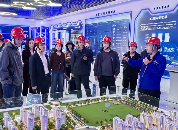 在智能建造指揮中心,項(xiàng)目技術(shù)總工向觀摩團(tuán)介紹了公司基本情況、工程概況,重點(diǎn)圍繞項(xiàng)目智慧工地系統(tǒng),講解了物聯(lián)監(jiān)測、安全管理、質(zhì)量管理、項(xiàng)目進(jìn)度、360度全景等8大模塊內(nèi)容。項(xiàng)目部設(shè)立了智慧工地管理平臺(tái),將項(xiàng)目進(jìn)度、質(zhì)量、安全、勞務(wù)等各方面數(shù)據(jù)集中統(tǒng)一管理,方便了管理人員科學(xué)分析與決策;安裝了塔吊在線監(jiān)測、吊鉤盲區(qū)可視化系統(tǒng),保障吊裝安全,提高了作業(yè)效率;應(yīng)用了揚(yáng)塵噪聲在線監(jiān)測、遙控器控制揚(yáng)塵噴霧等智能系統(tǒng),有效控制了揚(yáng)塵污染……一系列實(shí)際應(yīng)用及效果圖片,充分展示了項(xiàng)目高質(zhì)量、智慧化建設(shè)水平,觀摩人員紛紛拿起手機(jī)拍照記錄。