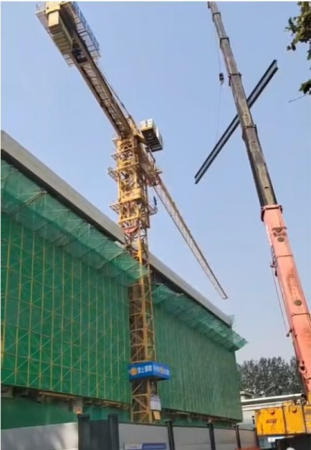 “大臂往右,慢一點……”塔吊下,信號工通過對講機指揮塔吊緩慢旋轉(zhuǎn)避讓。隨后,負重吊車精準、平穩(wěn)地將鋼梁吊裝到施工區(qū)。
